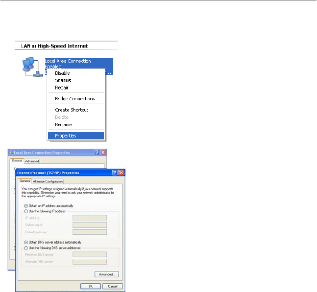 4. Click Properties, select Obtain an IP address
